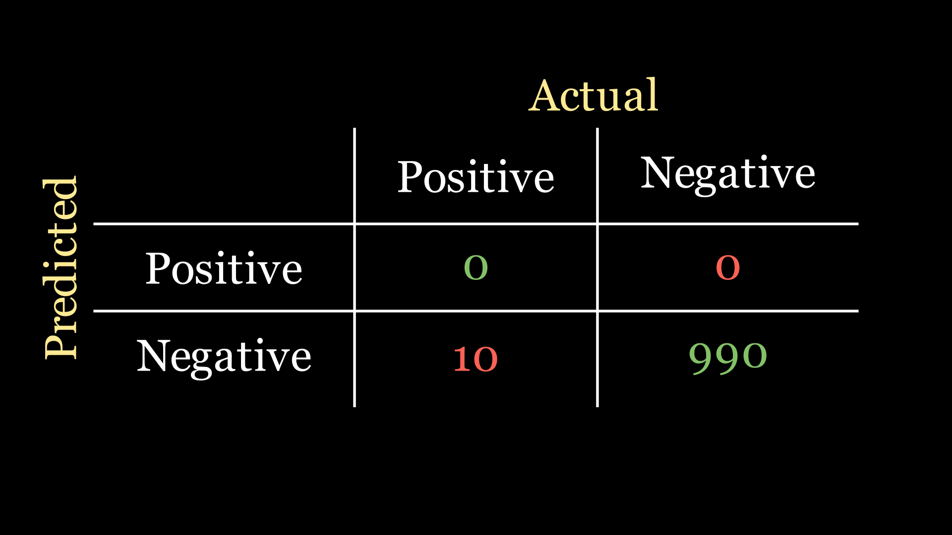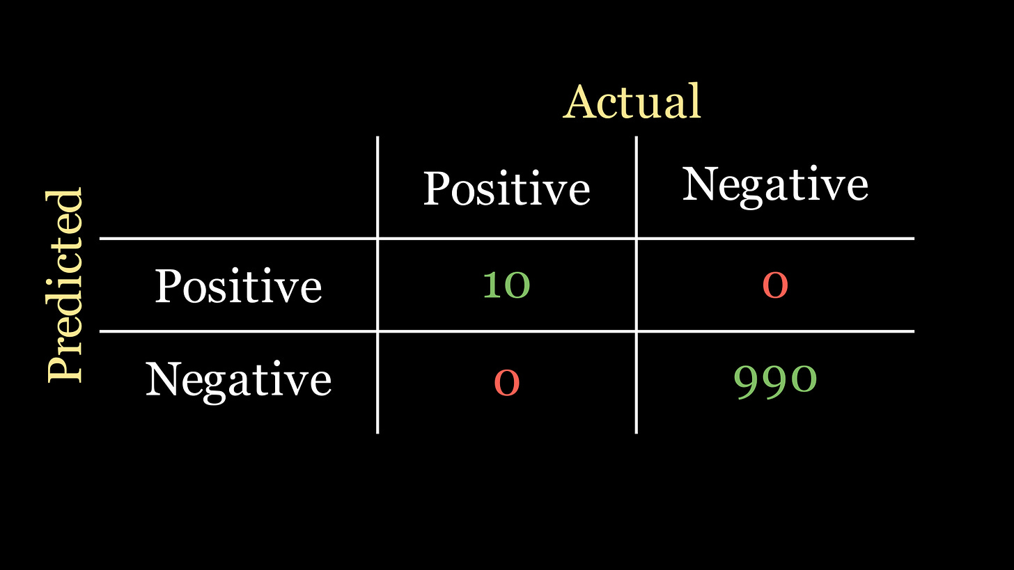 Let’s pause and have a think about the classification task that our company gave us. We know that only 1% of the patients in our data actually have the disease. So if we had n=1000 patients in our dataset, only 10 of them actually have the disease. The best confusion matrix scenario for a classifier for this problem would be the following: