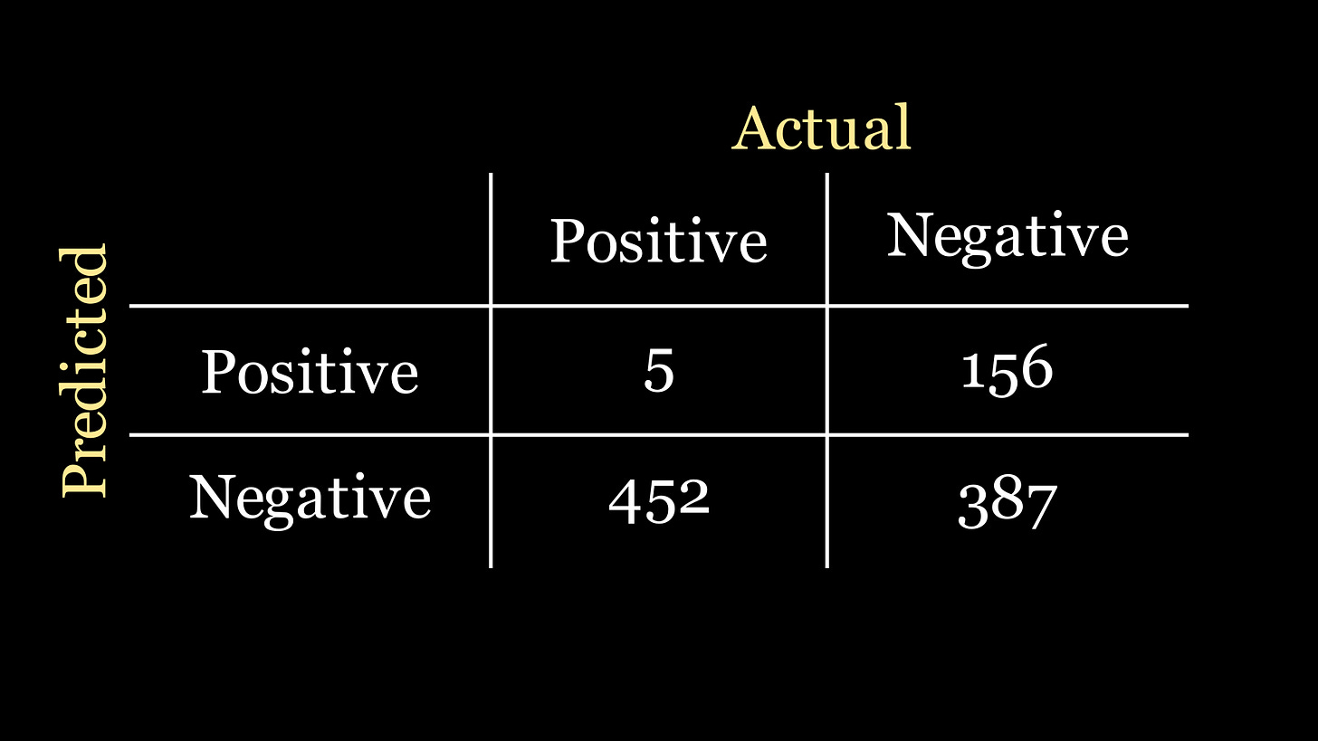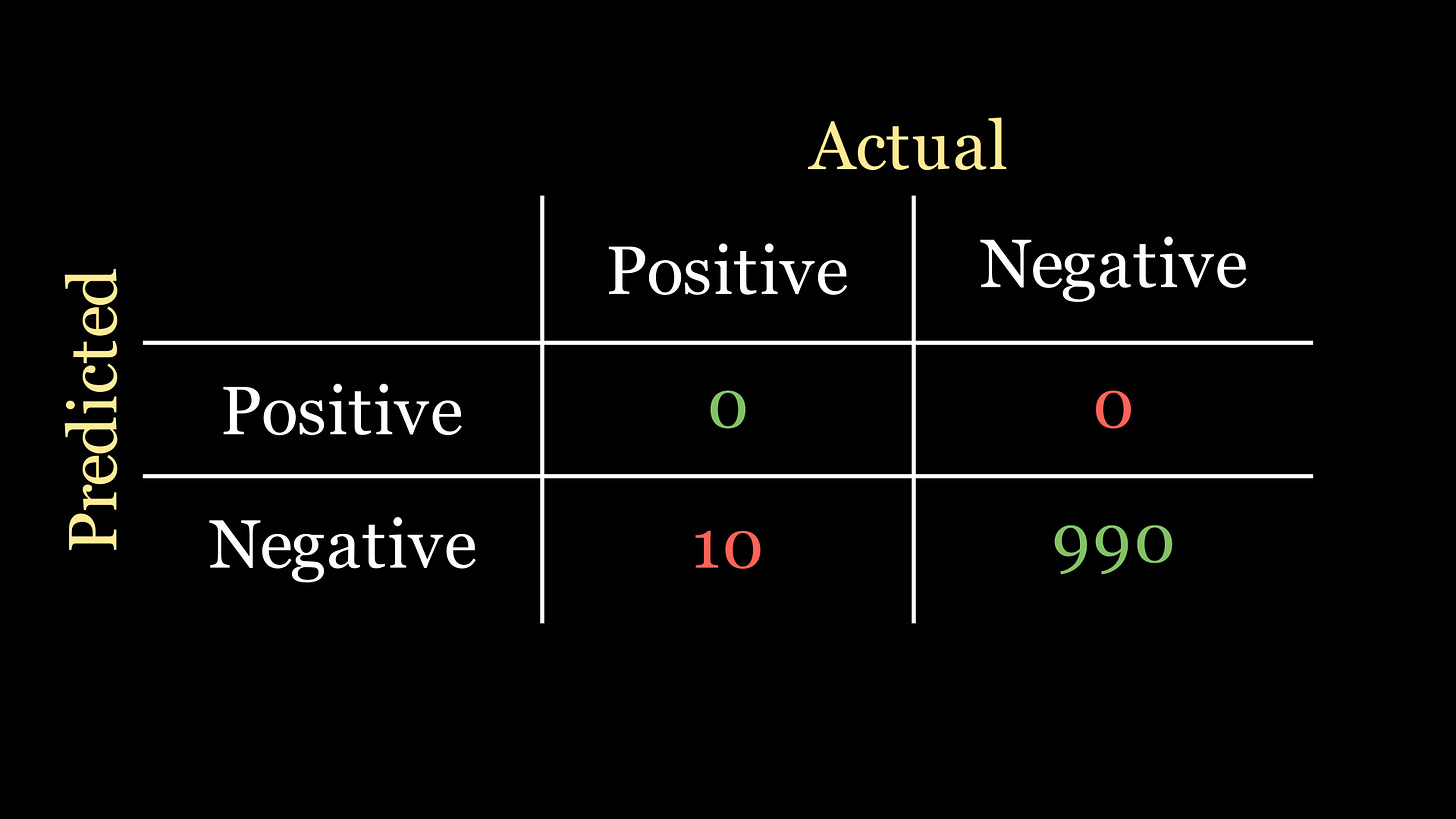 But the more important question is whether or not our colleague’s classifier is a good one. Despite the high accuracy, by the way it’s designed it doesn’t actually detect any instances of the disease at all! It just defaults to saying that no disease is present for any data instance.