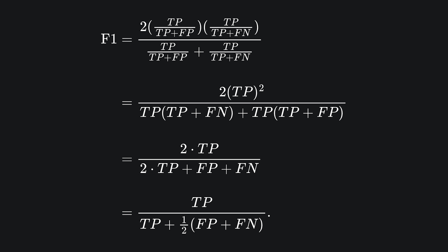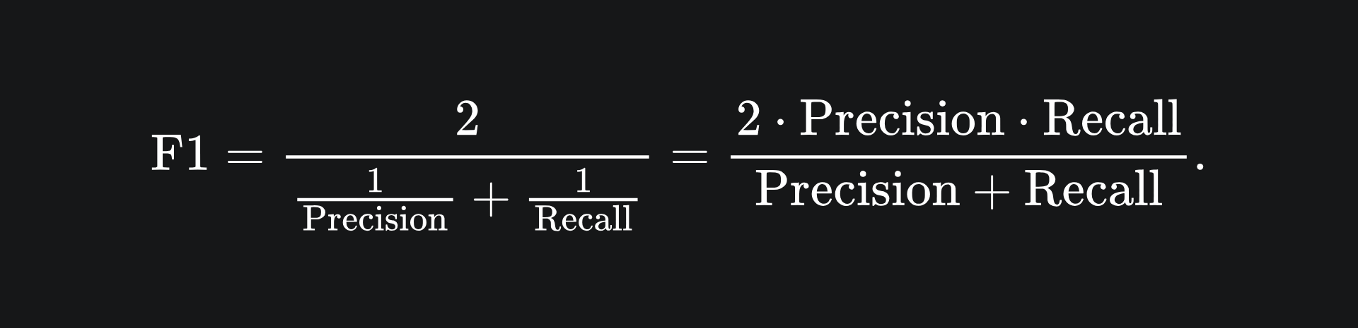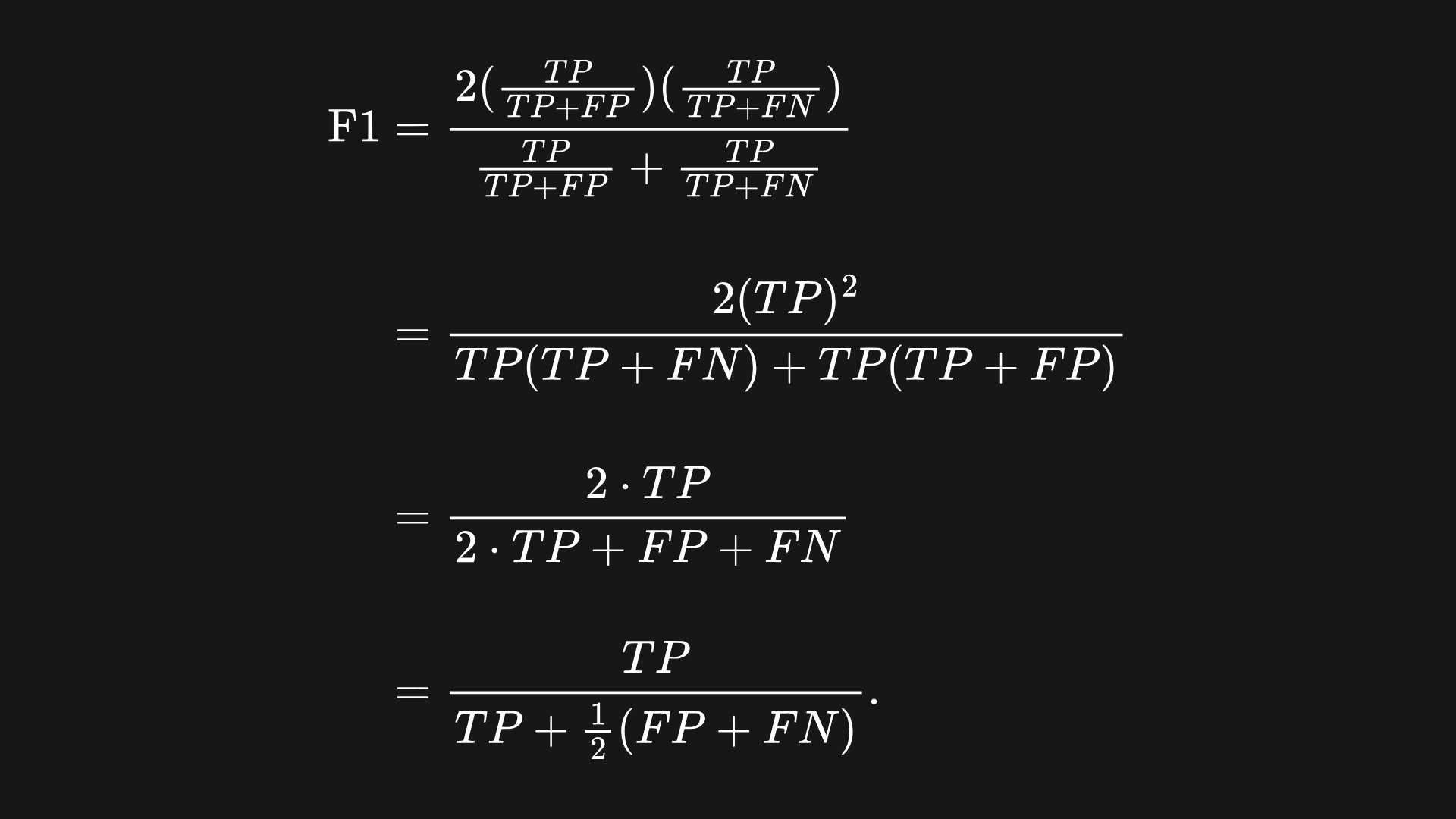 Namely, the F1 score is the harmonic mean of precision and recall. We can also write the F1 score formula terms of TP, FP and FN: