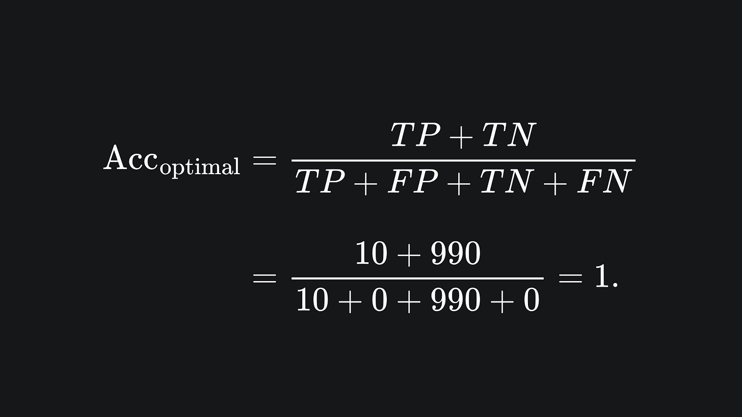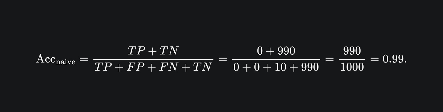 ❓ Can you see how we could build a super simple classifier that achieves an accuracy of 99%?