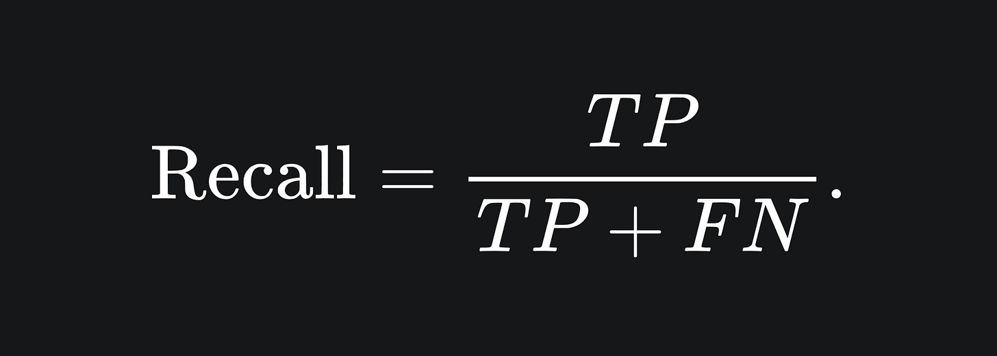 Recall: represents the proportion of actual positive data points that were predicted as positive. Ideal for when you want to minimise the number of positive results that slip past the model. Recall concerns the first column of the confusion matrix.