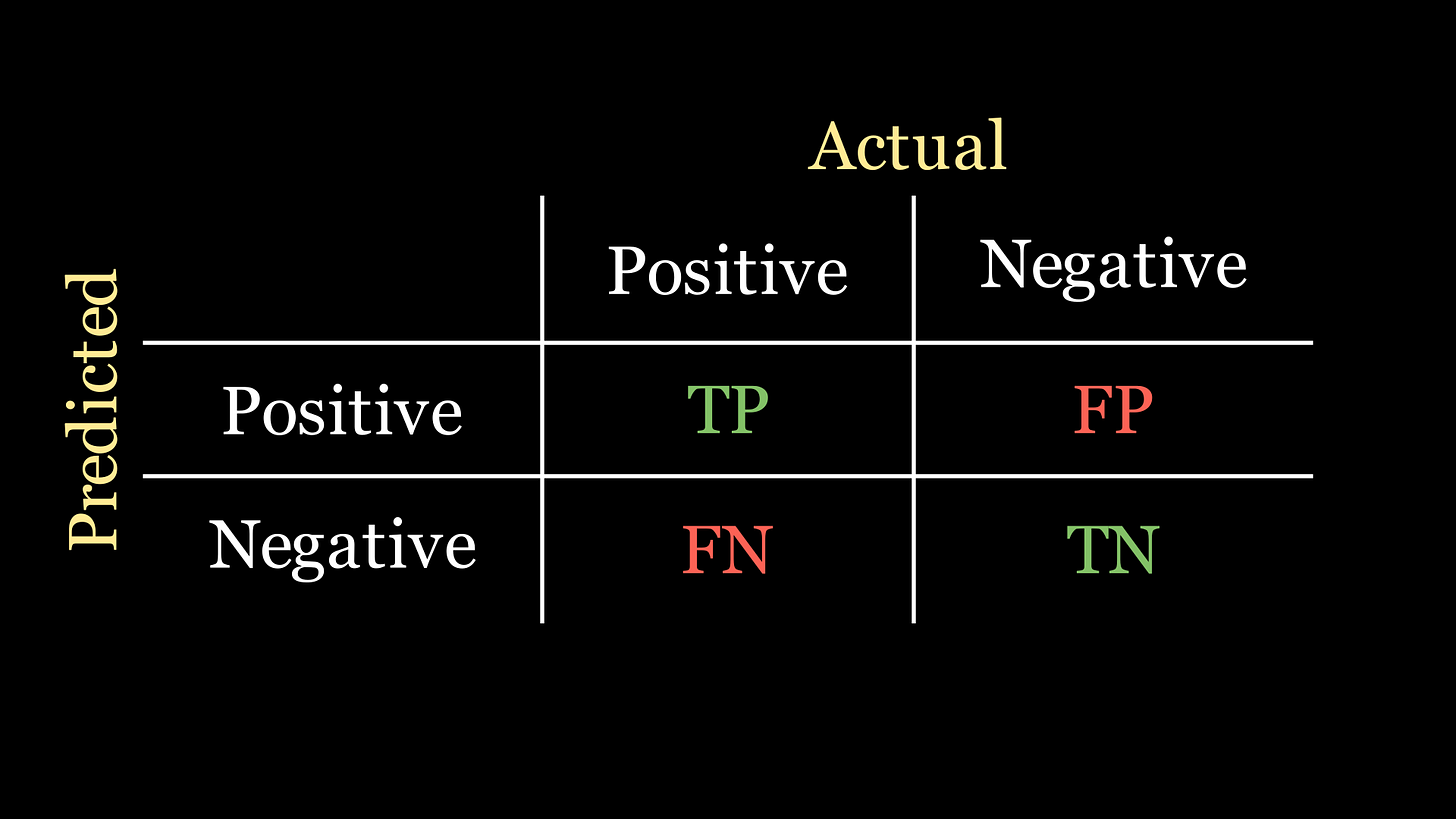 Precision: represents the proportion of predicted positive data points that were actually positive. Ideal for when you want to minimise the number of incorrect positive predictions made by the model. Precision concerns the first row of the confusion matrix.
