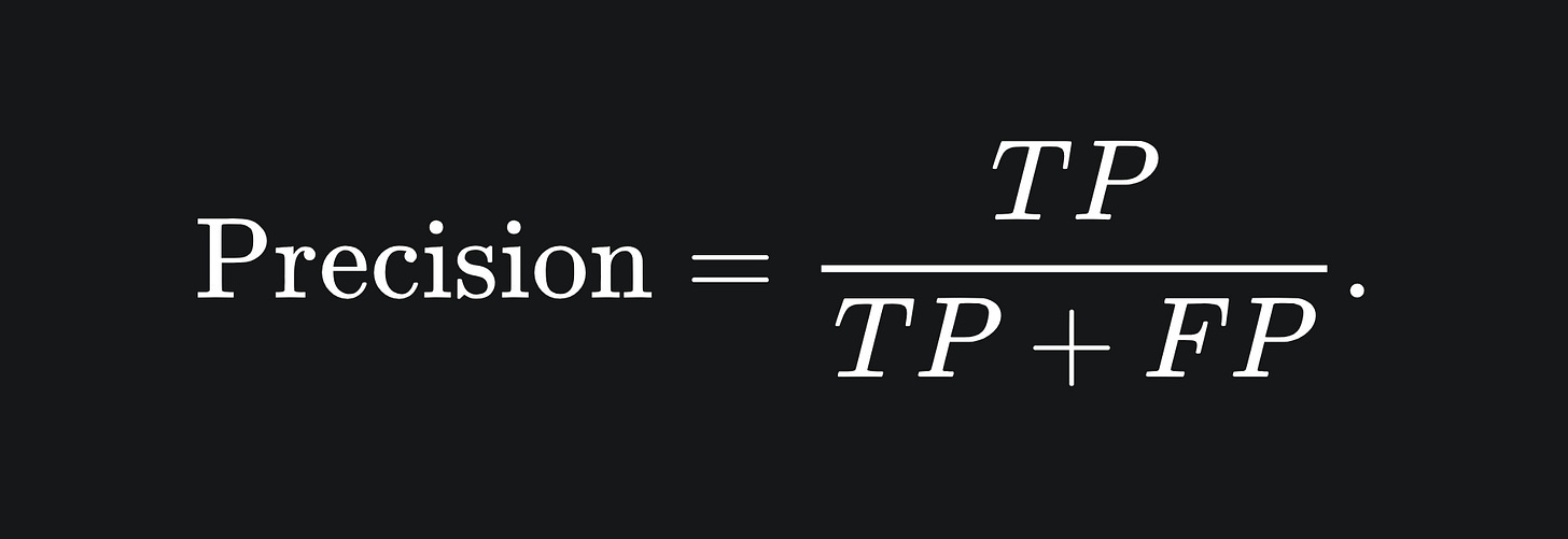 Precision is another performance metric, which measures the proportion of positive classifications that were actually positive: