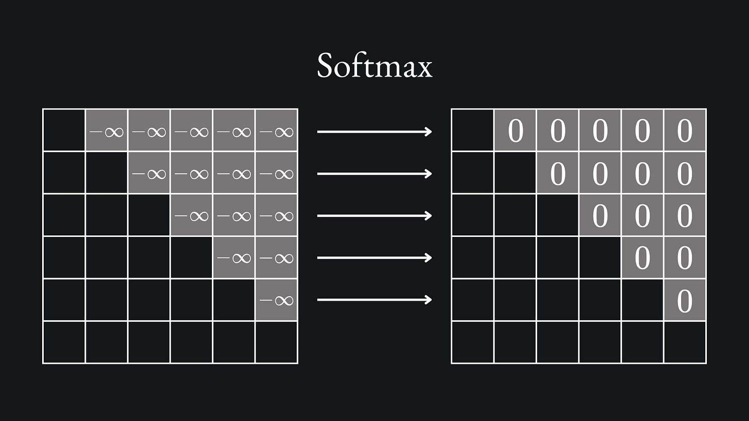 We construct the Query-Key dot product matrix as usual, except we set the values above the leading diagonal to negative infinity:
