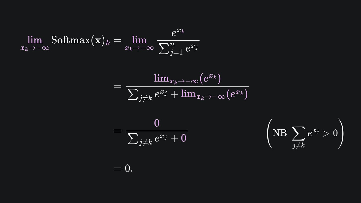 The next step, according to the usual procedure, is to apply the Softmax activation function to each row of this matrix. By doing so, all the negative infinity values will be mapped to 0, as shown by the following limit argument: