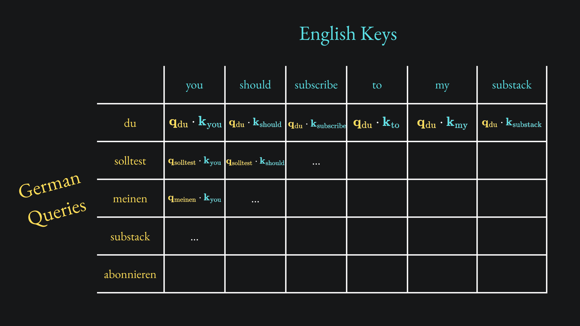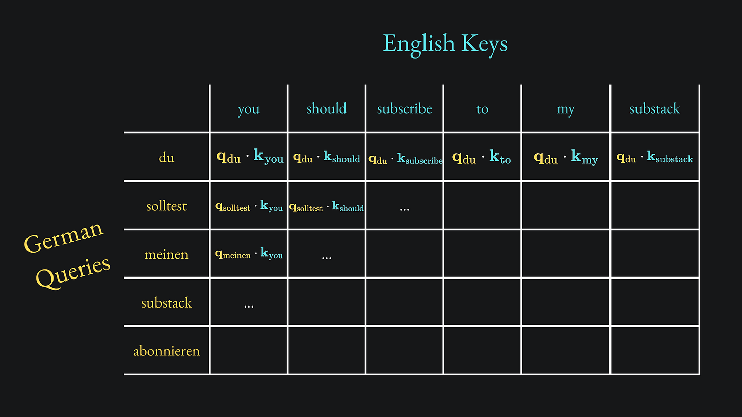 For instance, if the decoder has got up to „meinen” in the translation, then the corresponding dot-product matrix will consist of only the q vectors associated with „<BOS> du solltest meinen”, but all the k vectors in English: