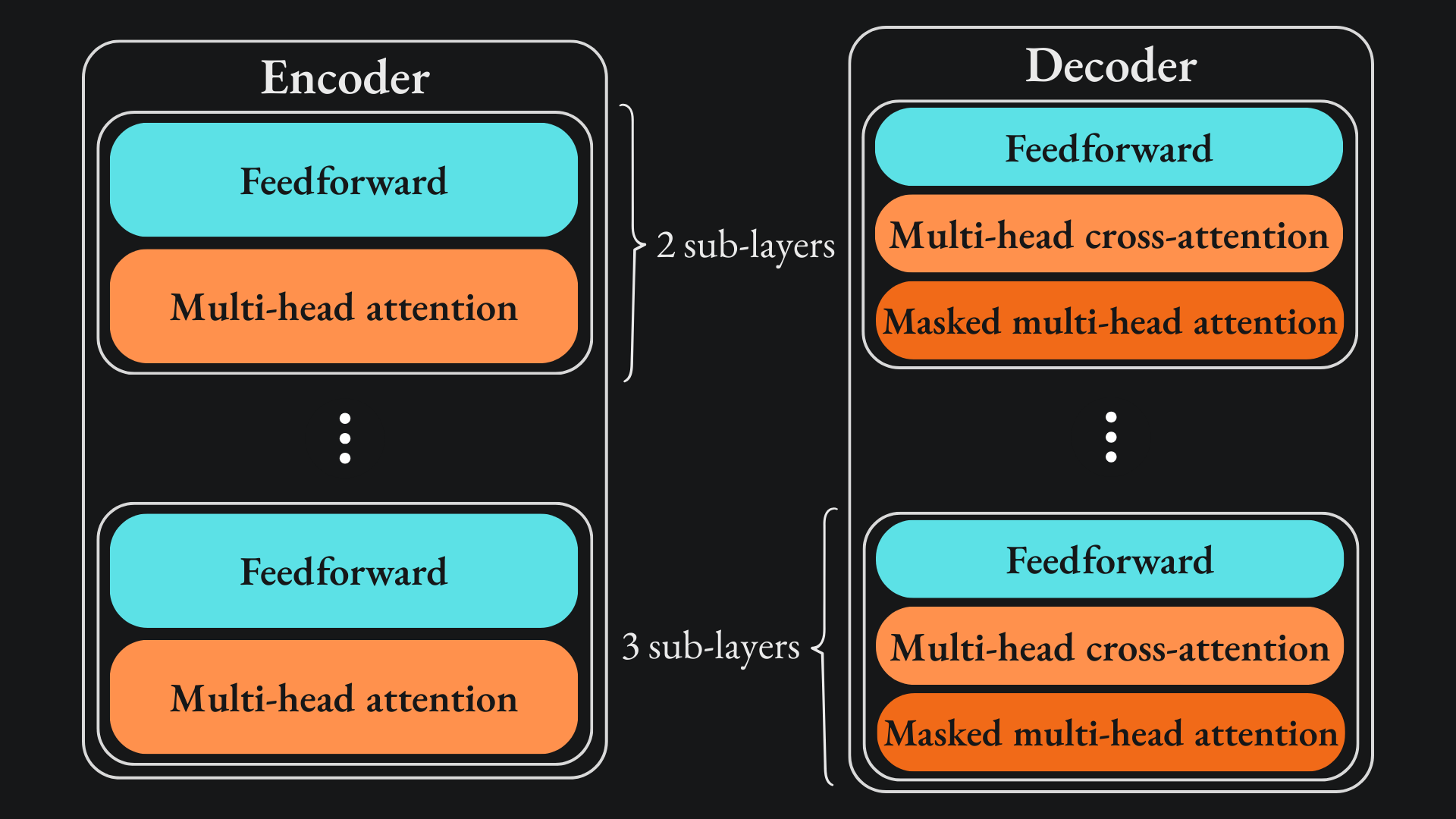 Either way, the results from the previous two sub-layers are sent to the final sub-layer of the decoder, the feedforward layer. We already discussed this one as part of the encoder architecture, so I won’t repeat it here.