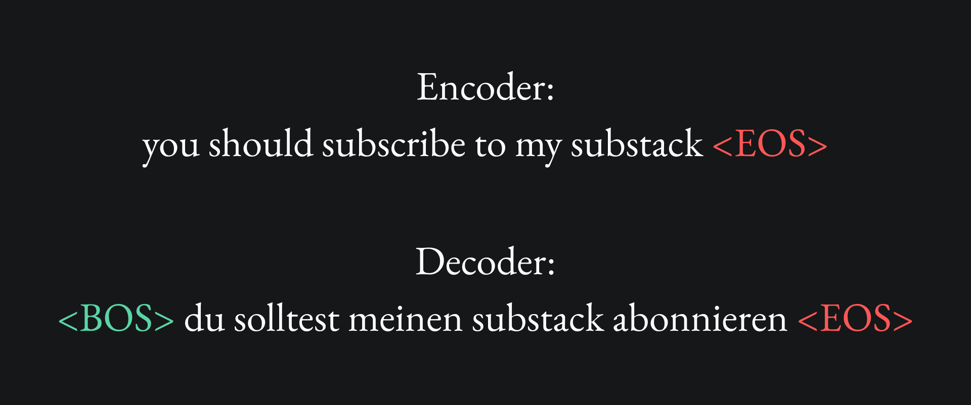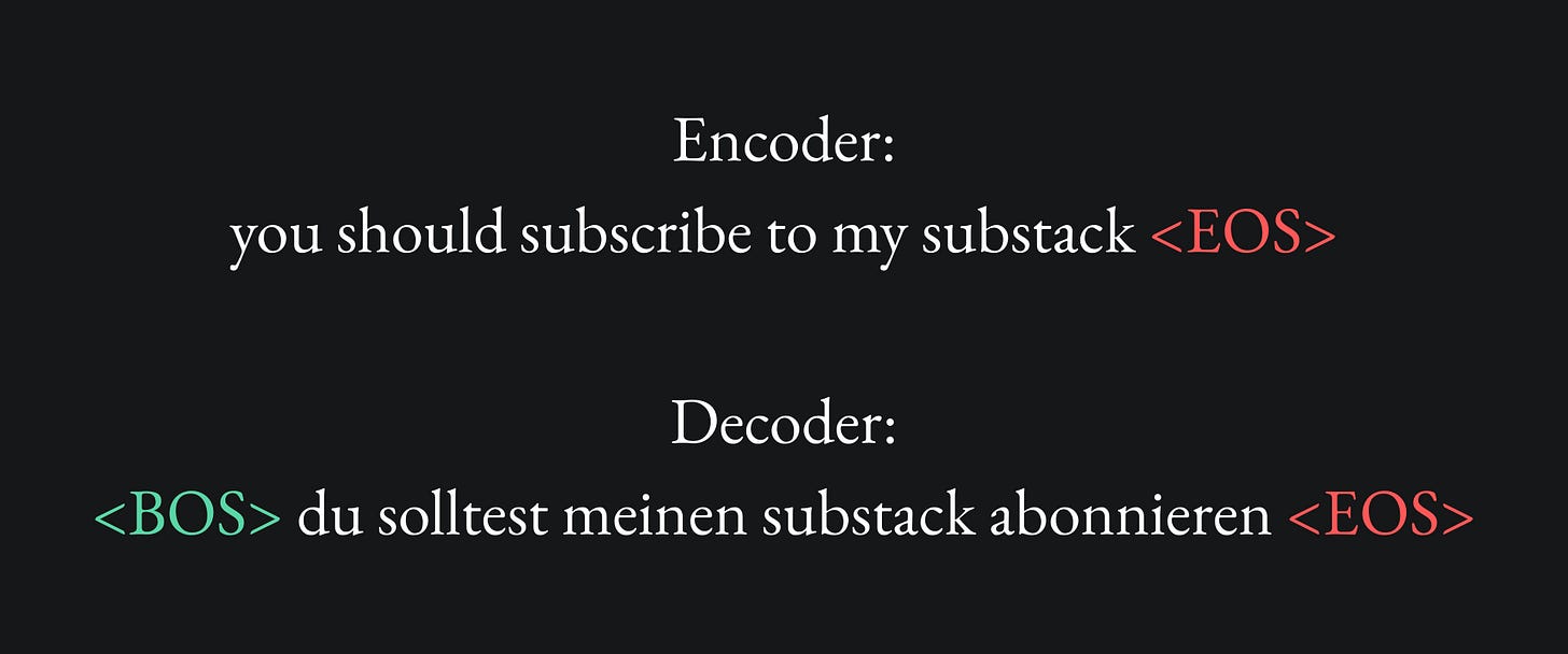For instance, if the decoder receives „du solltest” and predicts the next word as „Ohrwurm” (earworm), then we would penalise the model and, rather than allowing it to use „du solltest Ohrwurm” for the next prediction, we would simply tell it to use „du solltest meinen” instead. When we’ve got all the way to „du solltest meinen Substack abonnieren”, if the model does not predict <EOS> for the next (and final) token, then we’d penalise the model and stop the auto-regressive procedure for this training data point.
