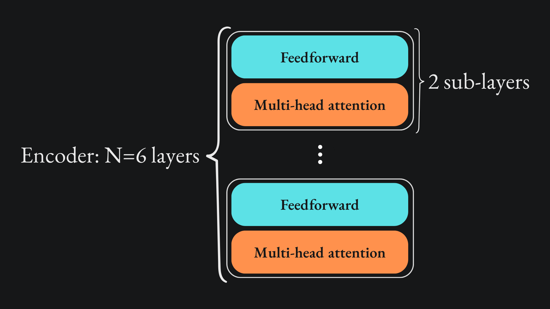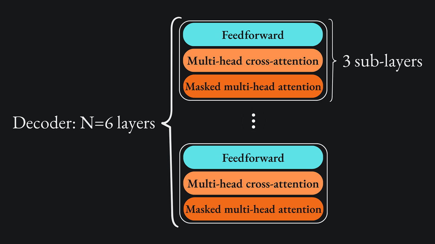 Similar to the decoder, these three sub-layers are repeated N=6 times. For any individual decoder pass, we: