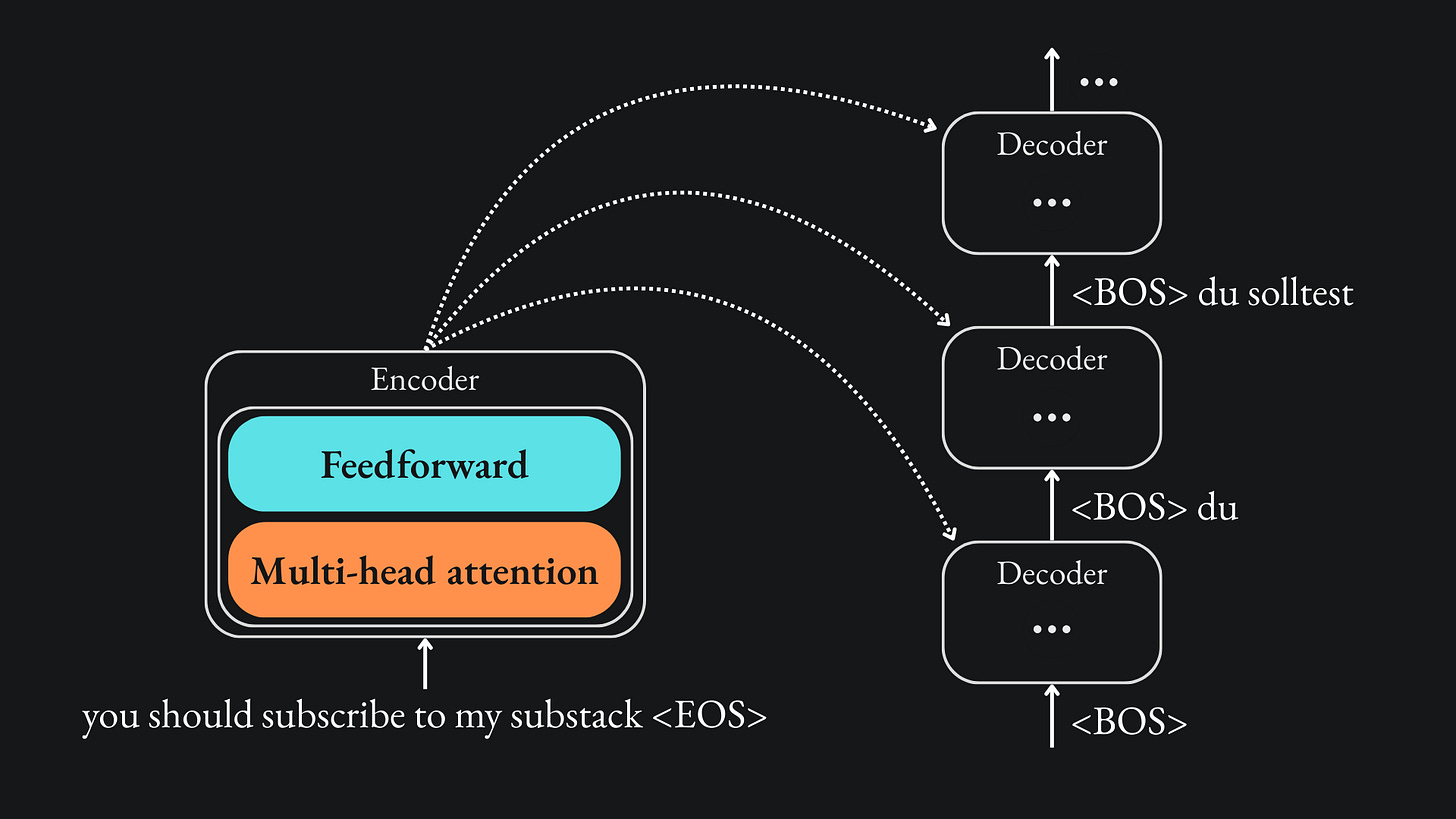 For example, if the decoder is at the stage of predicting the word after „meinen” in the translation, then the masked self-attention only allows for attending to the <EOS>, „du”, „solltest” and „meinen” tokens. The decoder will not have access to „Substack” or „abonnieren” yet. However, once we move onto the next word in the translation, we will then have access to „Substack” as well.