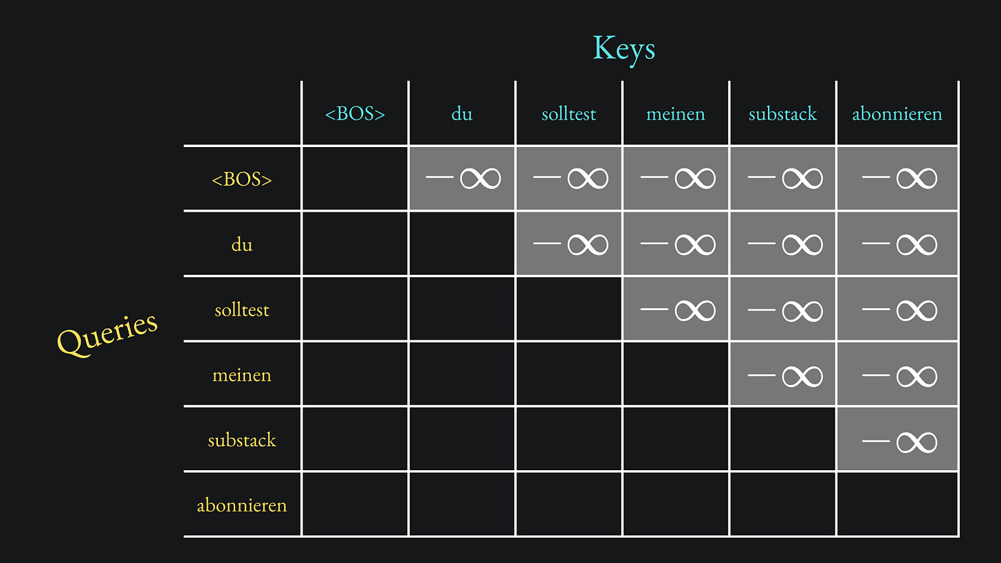 But when training the model, we cannot allow earlier words in the translation to attend to words that have yet to appear in the translation. For the example “you should subscribe to my Substack”, the full German translation is available in the training data. However, if the transformer is currently looking to predict the fourth word “Substack” of the translation „du solltest meinen Substack abonnieren”, then we of course shouldn’t reveal the word “Substack” to the model before it has made this prediction! Moreover, we would also not want to tell the model the final word of the sentence “abonnieren”, which could help the model unfairly infer the word “Substack” from the German rather than the information from the encoder (i.e. the original English sentence).
