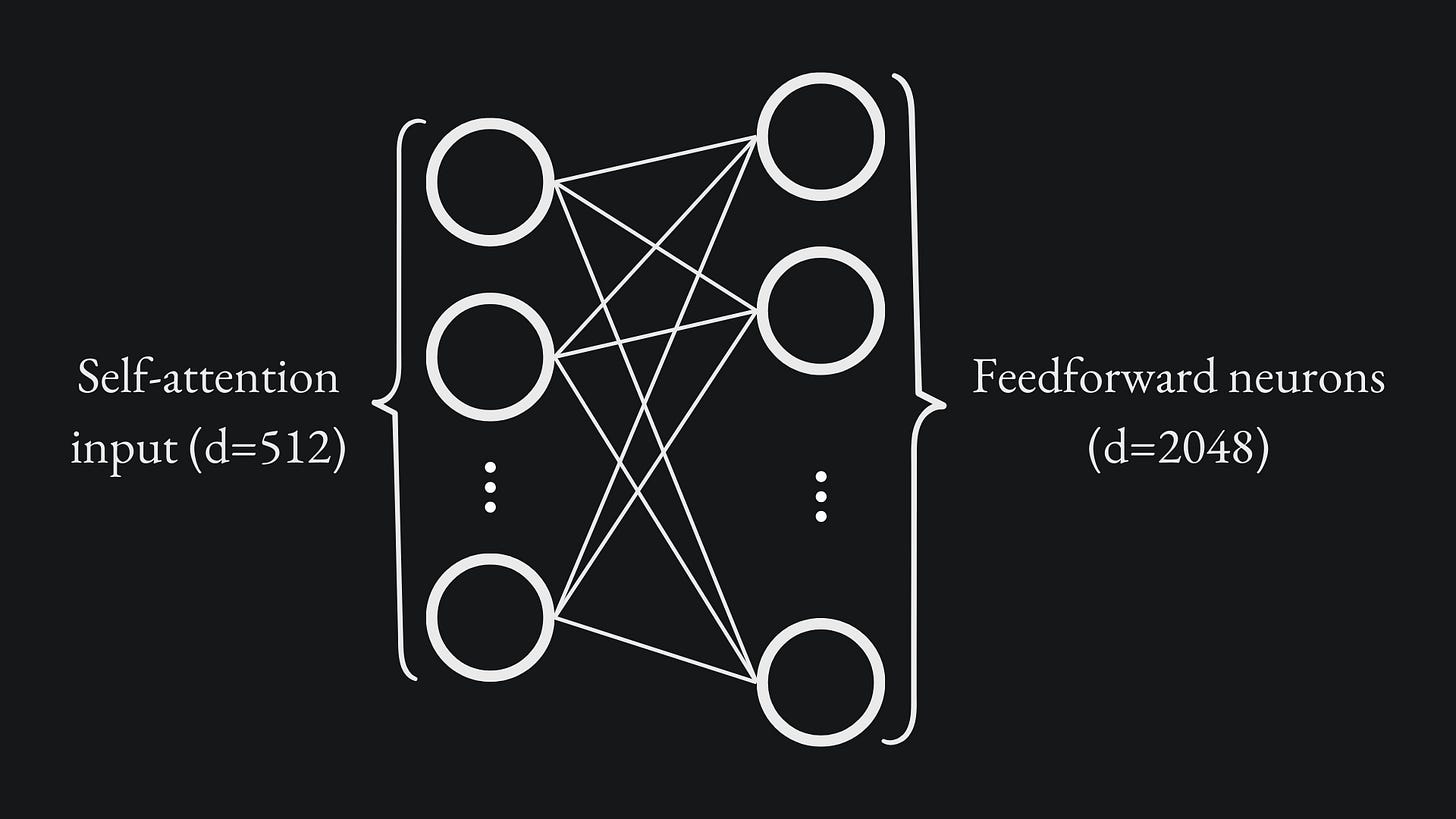 This is the bog-standard neural network layer that we all know and love. In this transformer, the feedforward layer acts on one word embedding at a time.