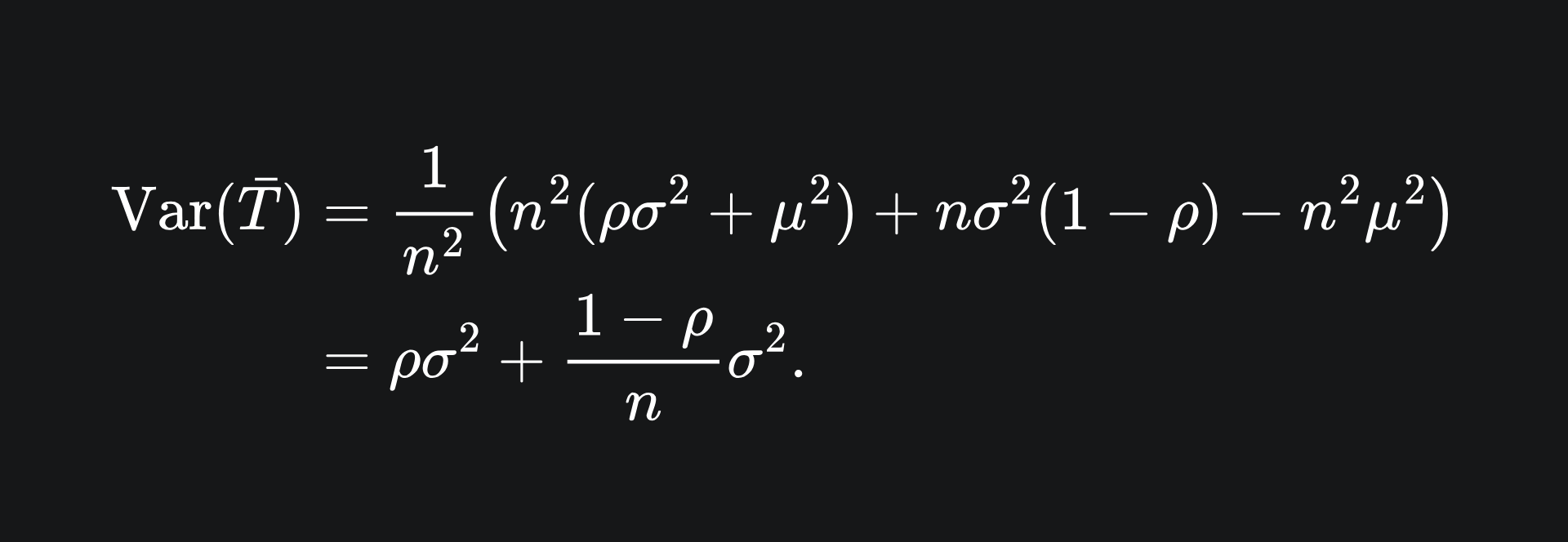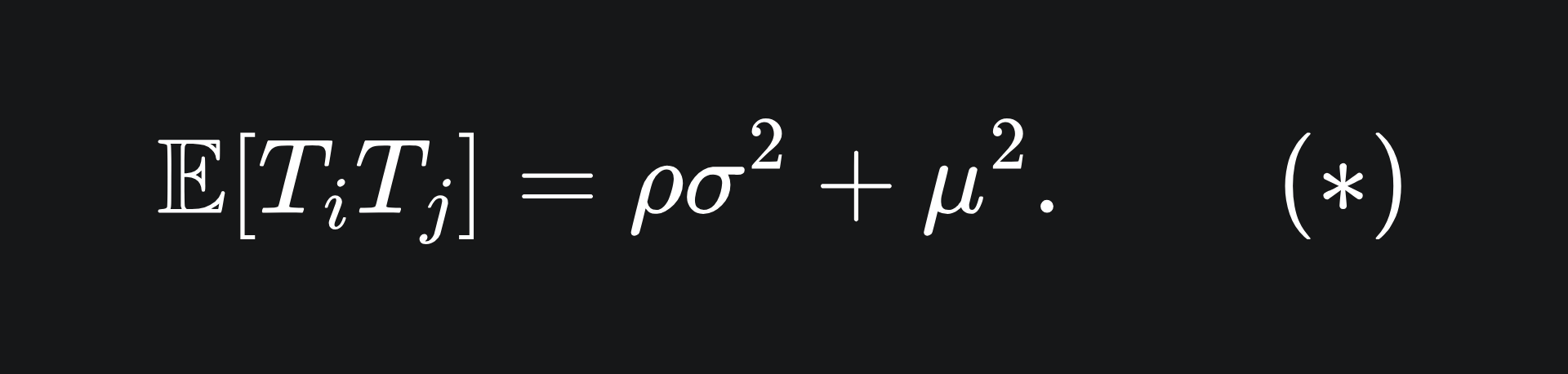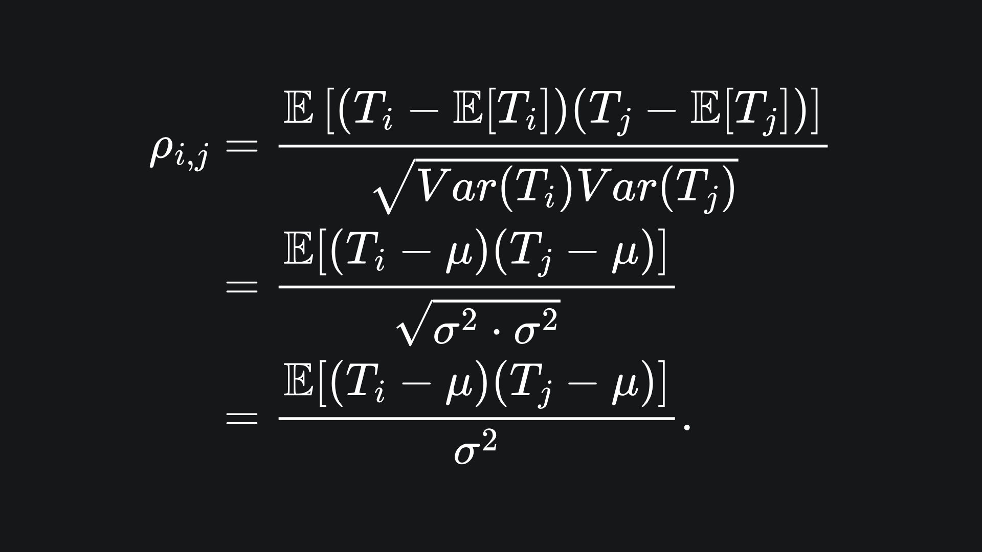 As the T_i and T_j are identically distributed, we can drop the subscript on ρ. But note that ρ=1 if i=j, a fact we will use later.