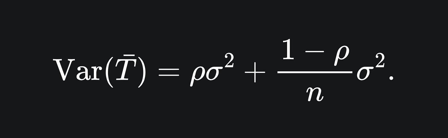 Suppose that we grow n decision trees in our ensemble: T_1, T_2,…, T_n. Since each tree is grown using the same recursive binary splitting procedure, the trees are identically distributed. Therefore, we can consider T_1,…,T_n as identically distributed random variables, each with, say, mean μ and variance σ^2.